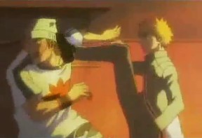 Va a pegar a Ichigo, pero Ichigo le da una patada en la cara que le hace caer al suelo, luego le patea cuando está en el suelo.