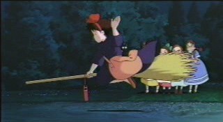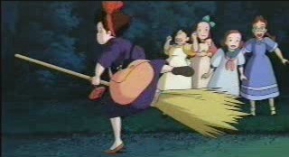 kiki despega asciende un poco pero luego desciende rápidamente, parece que va a estrellarse contra el suelo, pero remonta y va rebotando de árbol en árbol, al final se pierde en la lejanía.