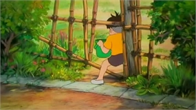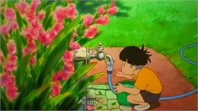 Sosuke se va a la guarderia dejando escondido entre unas plantas el cubo con Ponyo dentro.