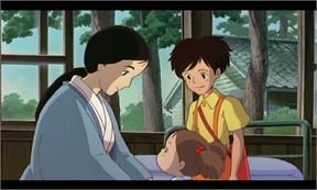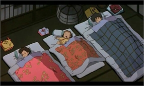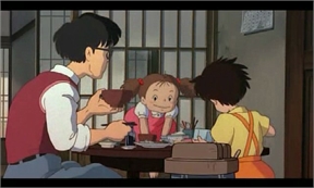 Es tarde, en la casa están trabajando en silencio, satsuki cuidando la estufa, su padre no sé qué hace de espaldas, es el agradable ambiente de tarde ántes de irse a descansar (para quien lo conozca, claro, no todos han tenido la misma suerte).