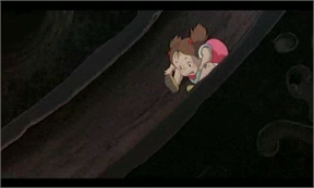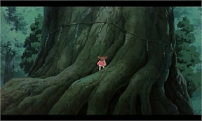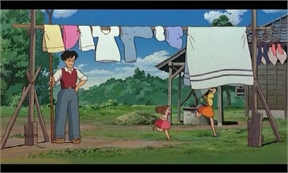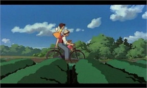(Satsuki le hace cosquillas a Mei y consigue que se ría. Todos ríen y se mojan. El Mak-kuro Kurosuke vuela al árbol del alcanfor)