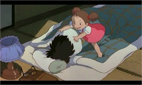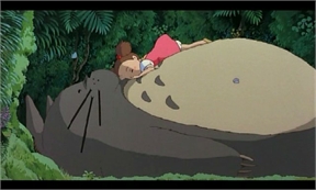 El totoro enorme duerme, Mei se sube a su estómago.