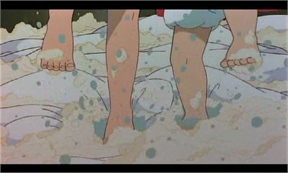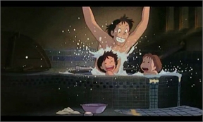 (Satsuki acaba de lavarse a toda prisa y se mete en el agua con los demás, que es lo que se hace en Japón, no se baña uno en la bañera, la bañera sirve para relajarse, hay que entrar ya limpio en ella)